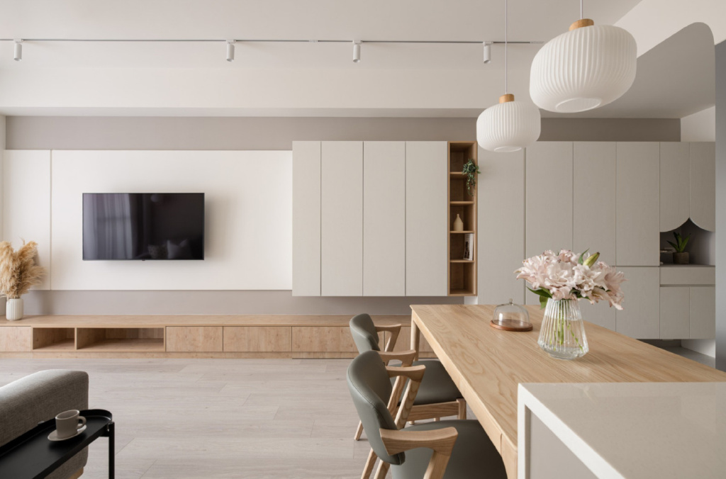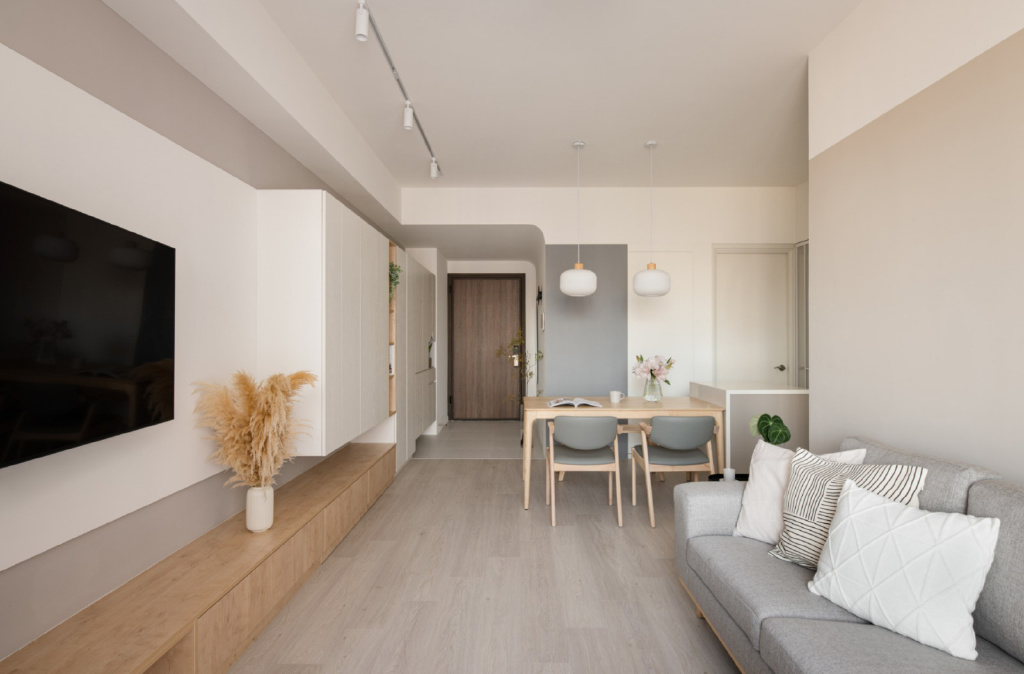 玄关柜延伸至电视墙,并以地台、悬浮储物柜、开架来做衔接处理。在保留下实用性的同时,整体性也得到了保证,且不会让空间显得太过封闭。