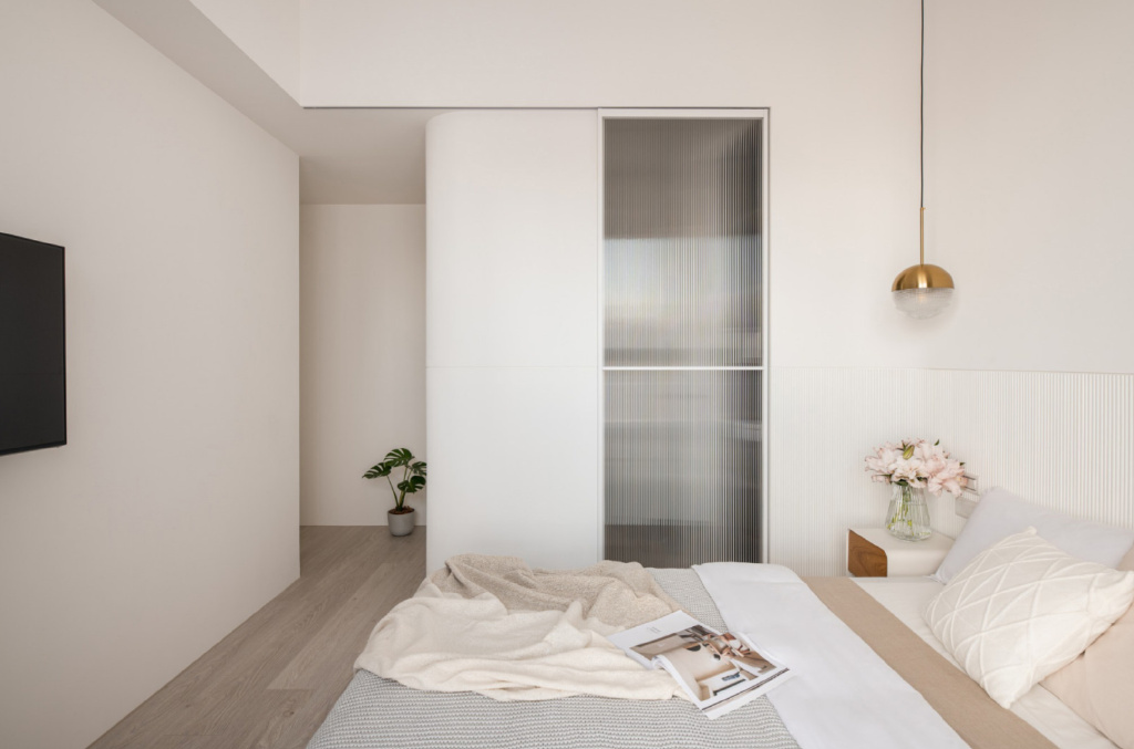 主卧内原有的衣帽间正常保留,并通过一扇长虹玻璃移门隔断,遮挡了内部的凌乱。同时,长虹玻璃本身的颜值表现,也一定程度提升了空间的美感。