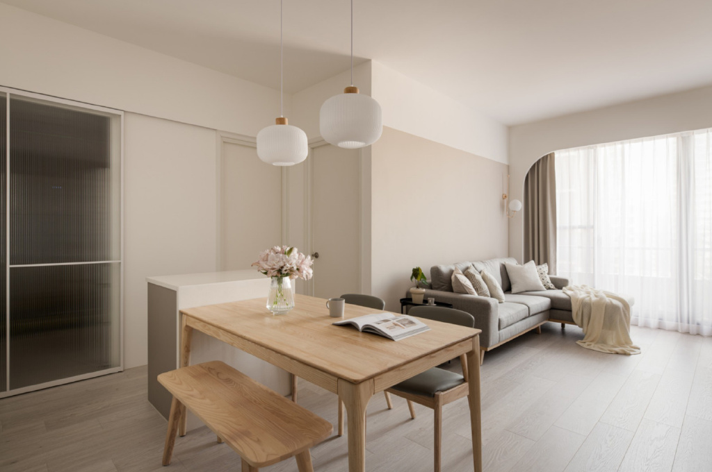 通过玄关就是餐厅,由于空间是横向结构,采用餐桌+小尺寸岛台布局,在带来一些储物能力的同时,视觉比例也和谐了许多。