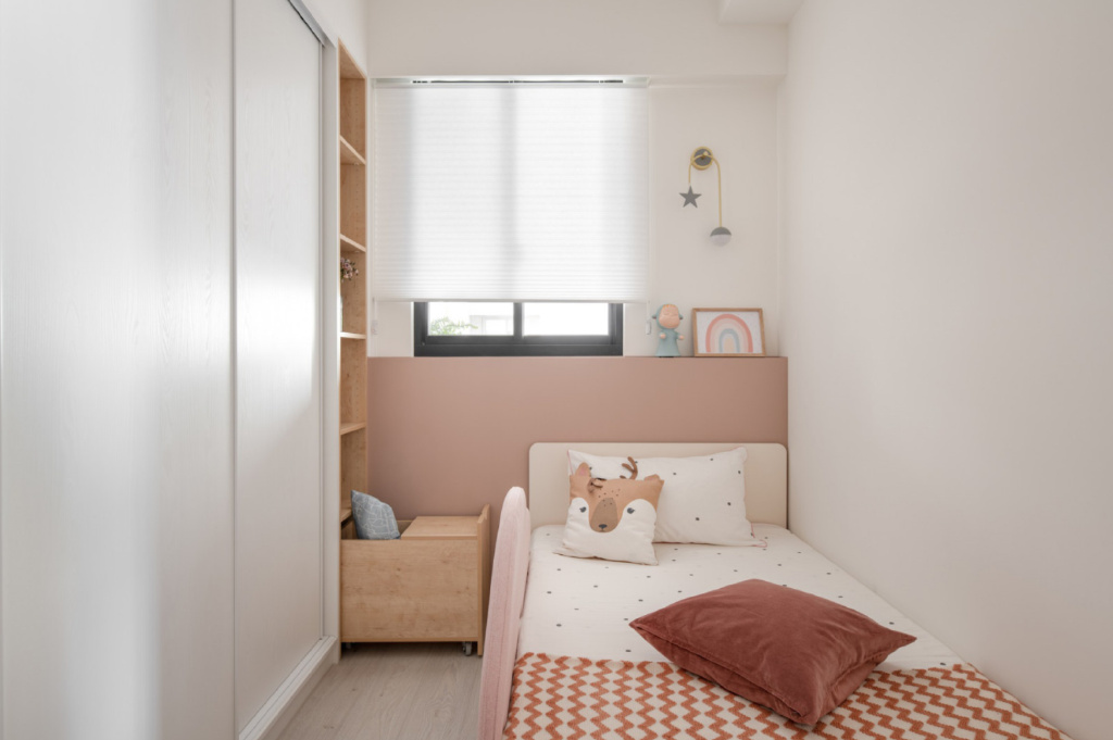 儿童床贴着墙体摆放,不仅仅是为了节省空间,也更有睡眠安全感了。而组合式的衣柜、书桌、书架设计,也在实用中强调了整体的秩序感。