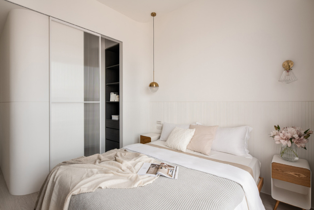 主卧延续了外面的清爽与温馨,并通过墙角抹圆的方式,让床头形成了一个半弧形结构,继而减少了空间的生硬与尖锐,且给予睡眠更多的包裹感。