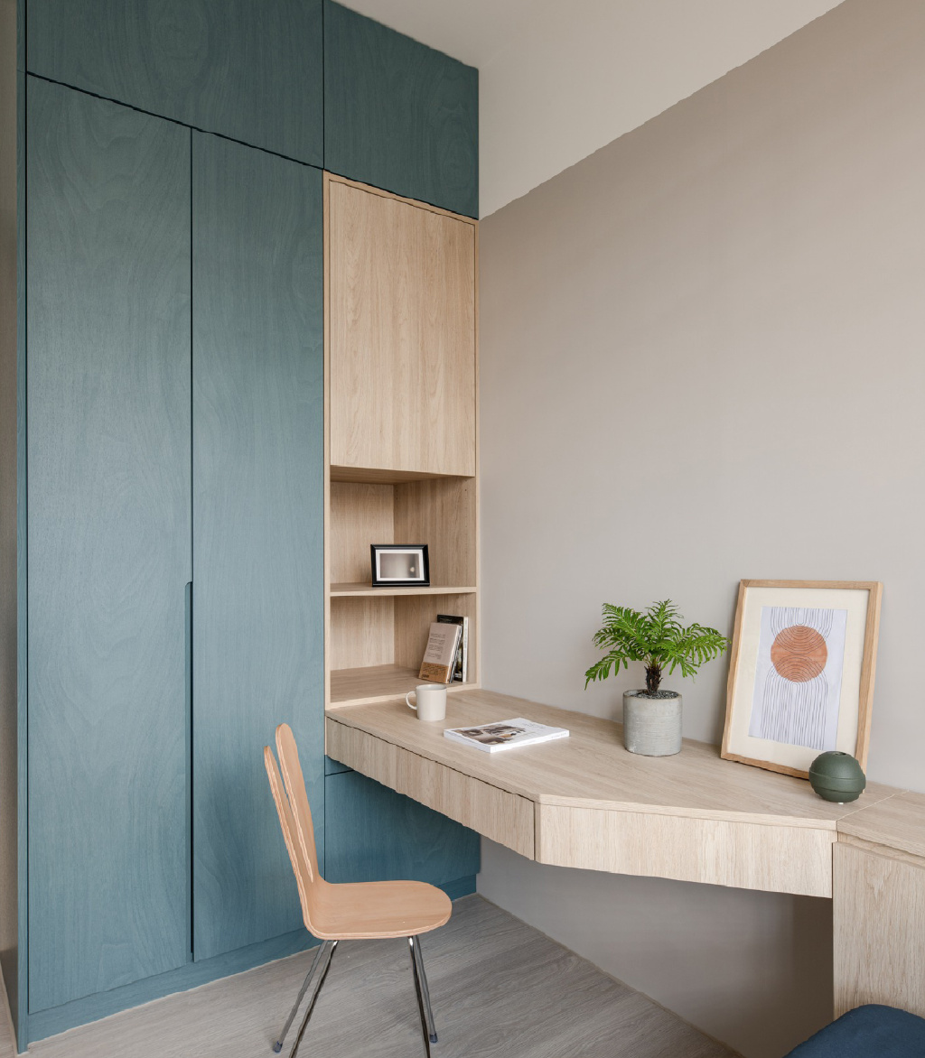 考虑到该房间主要以办公为主,柜门做深蓝色饰面,也是为了让屋主在工作时,可以有一个沉静的办公环境。