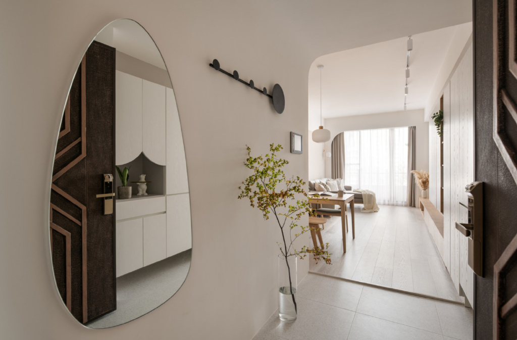 细化优化:左侧墙顶面转角处用弧形过渡,搭配上异形全身镜、衣架、绿植,不仅功能性非常强,还做到了简约不失别致。
