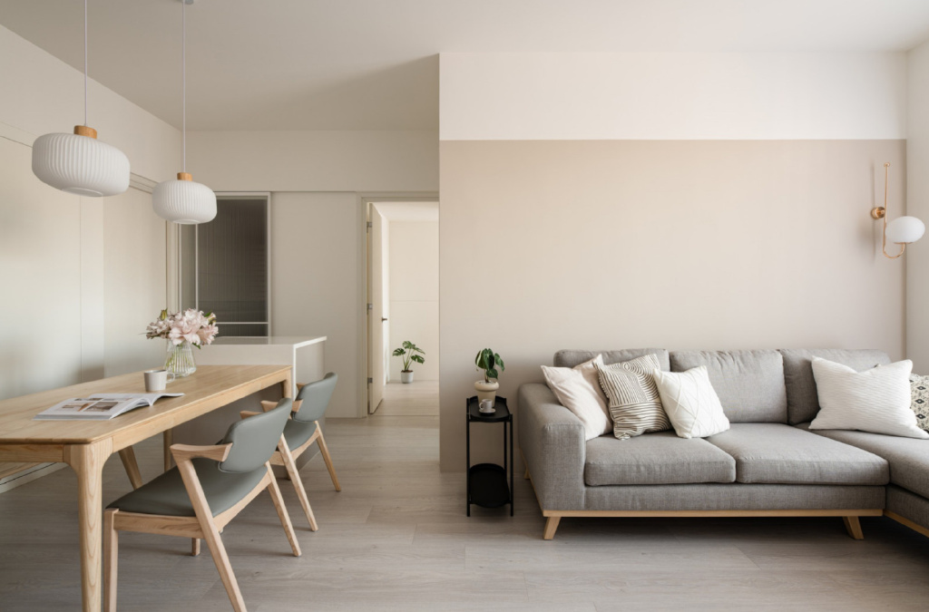 餐厅看向客厅视角,整体化繁为简,以最简单最纯粹的方式,还原了空间本质。而在开间尺寸比较有限的情况下,舍弃常规的茶几,也赋予了空间更多的灵活性。