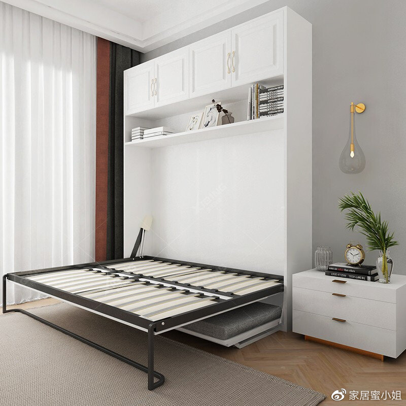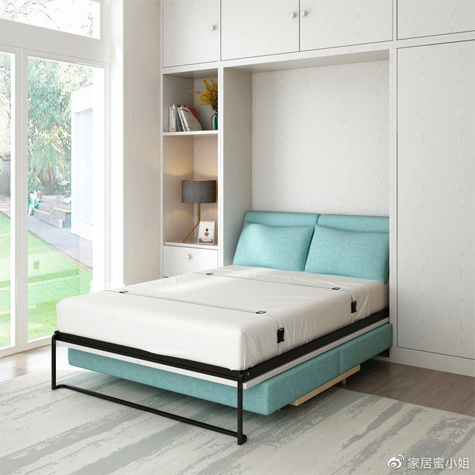 墨菲床就是隐形翻床,在平时不用的时候可以翻转起来和柜子融为一体,在用的时候只需要将其放下来,就可以变成一个床铺了。