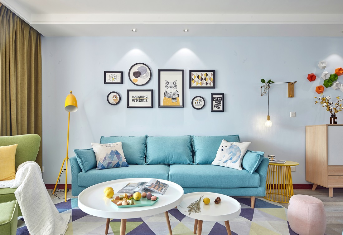 淡蓝色的墙面配上蓝色沙发,白色茶几,挂上几幅简单的挂画,给人一种清新淡雅的感觉。
