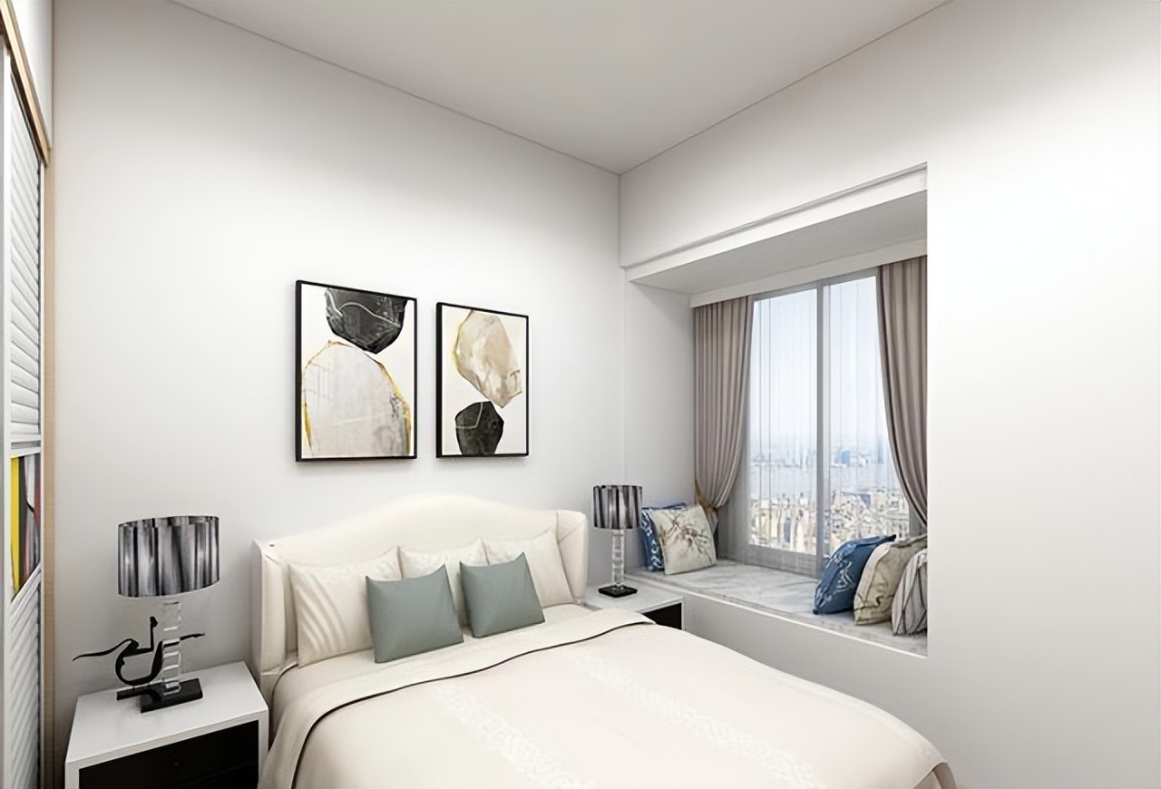 主卧区域是整个空间的主角,采用暖黄色调的墙面和灰色床,打造出突出而不突兀的美感。