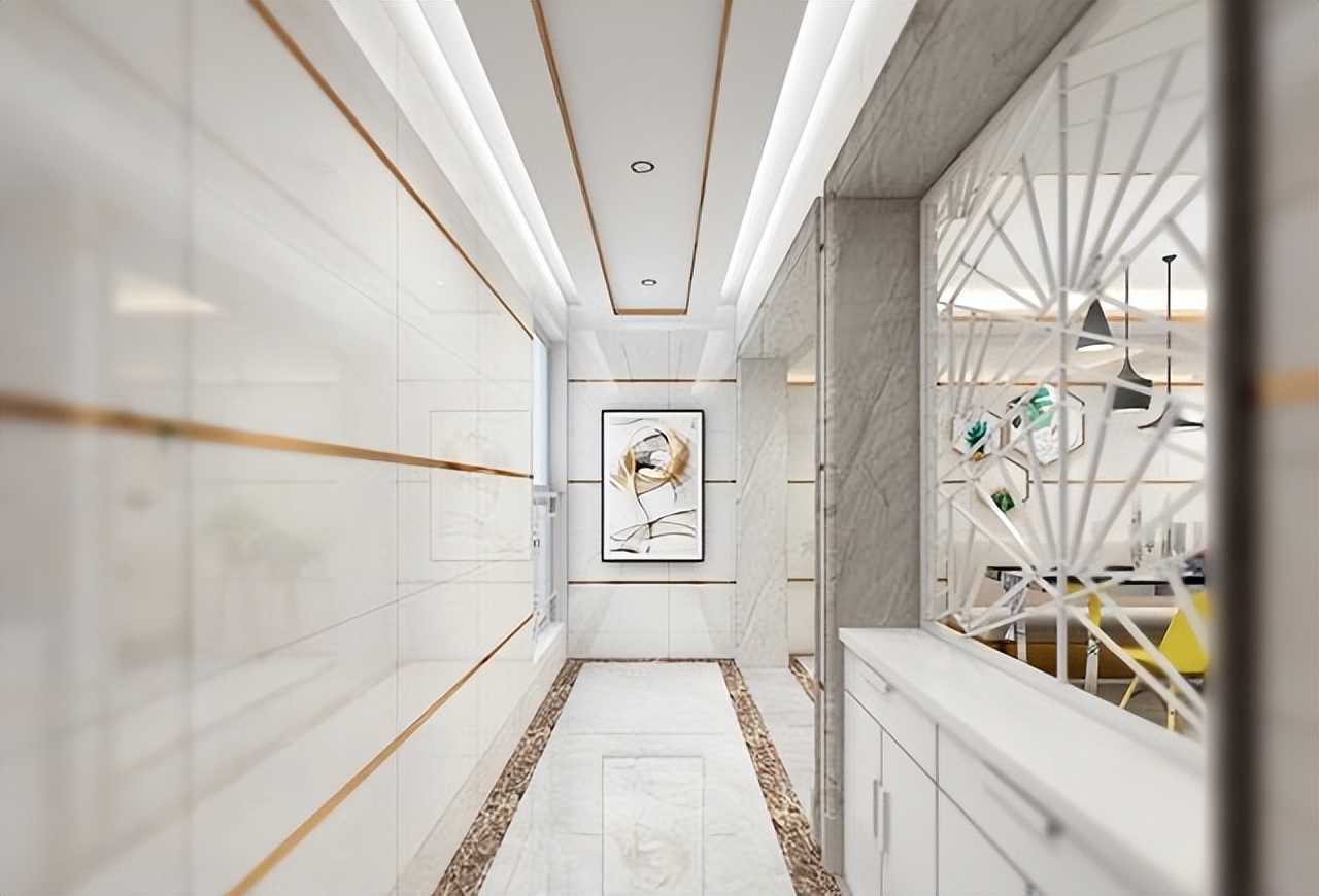 在入户玄关位置,设计了一个双洞,靠窗户位置进行扩大,以便充分利用自然光线,同时打掉原有墙体形成了一个可内藏鞋柜的位置。为了避免光线不足,使用了半截式鞋柜,并在上部加了一个艺术隔断,有效遮挡视线,同时不影响光线的进出。