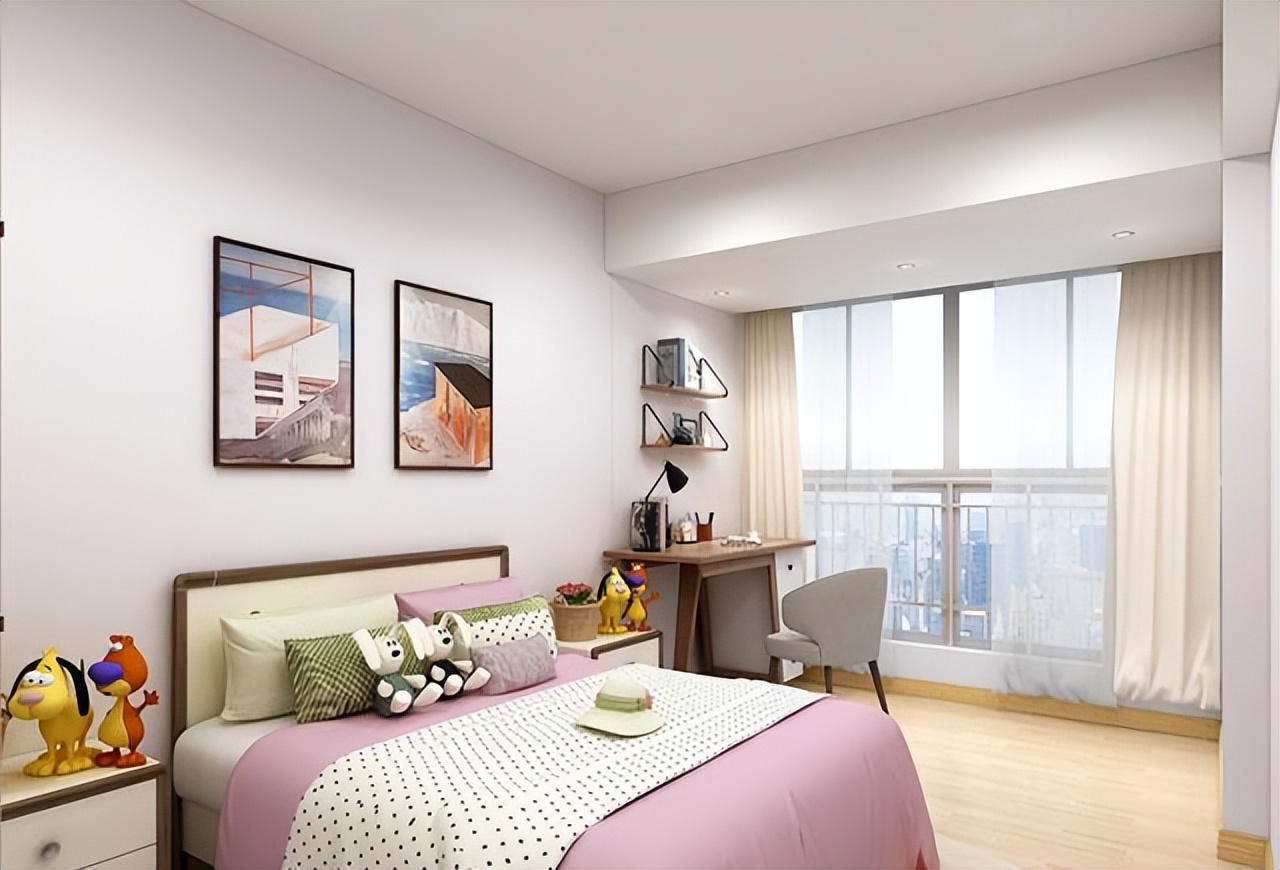 女孩房区域,因为有落地窗户,采用了相应深色的粉色,增加阳光的照射下,让人感觉置身于童话之中。