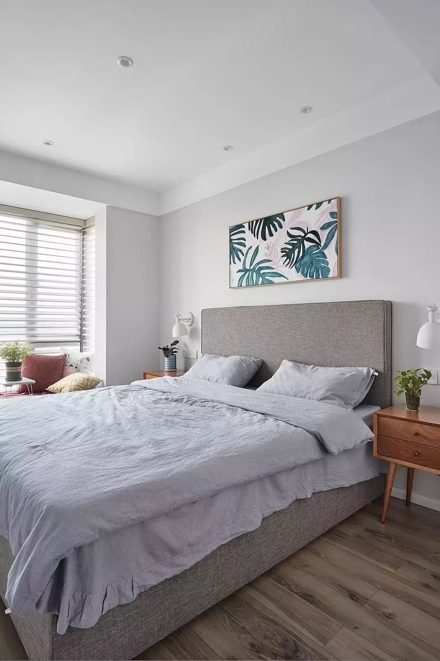 次卧整体现代大方的格局,灰色布艺床搭配蓝灰色床单,结合对称的布置,床头墙以芭蕉叶装饰画引出轻快愉悦清新的氛围感。
