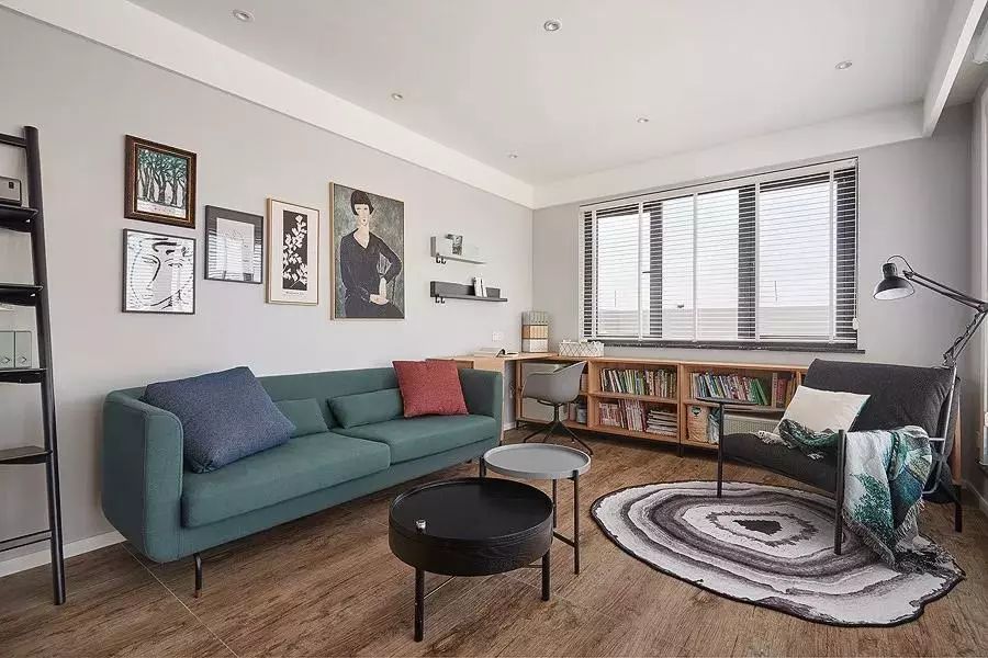 沙发背靠矮搁架和墙面,保证沙发有所依靠,又保持了开阔空间的通透感。