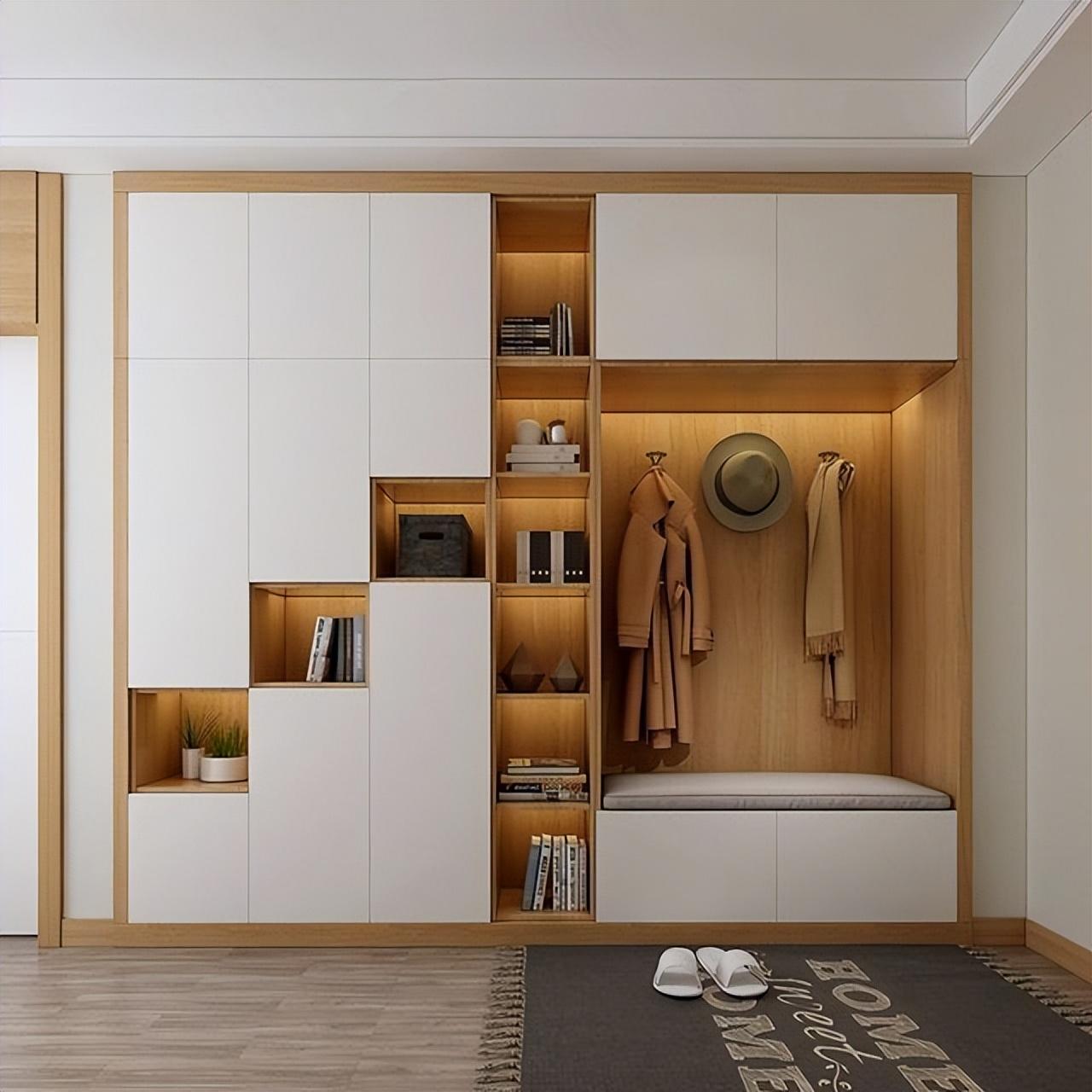 一定要做通顶悬空设计鞋柜,不仅增加收纳还底部悬空放可以放常用的鞋子,做鞋柜换鞋凳一体设计,坐下换鞋不占地避免弯腰。