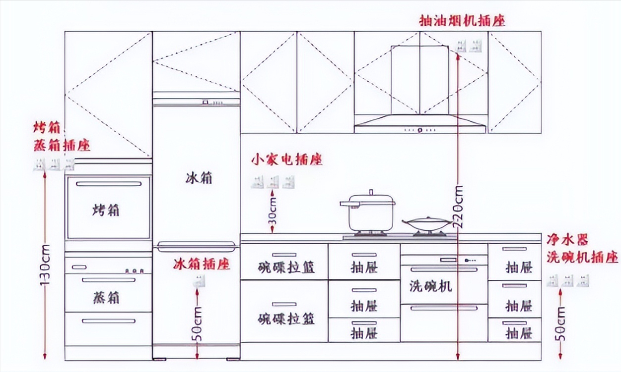 2、电源插座布局不合理以及严重不够用以前我们说过插座的布局和尺寸,这都是经验之谈,厨房、客厅插座不够用,来插排容易绊倒,客厅电视插座被家具遮挡,完全是败笔。正确的模式应该是这样的。