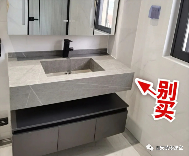 ▲像这种最容易翻车的岩板浴柜,坚决不能给老人使用,尖角外露,而且是非常坚硬的岩板,如果没有做干湿分离,卫生间潮湿容易滑倒,空间又小,非常危险的家具