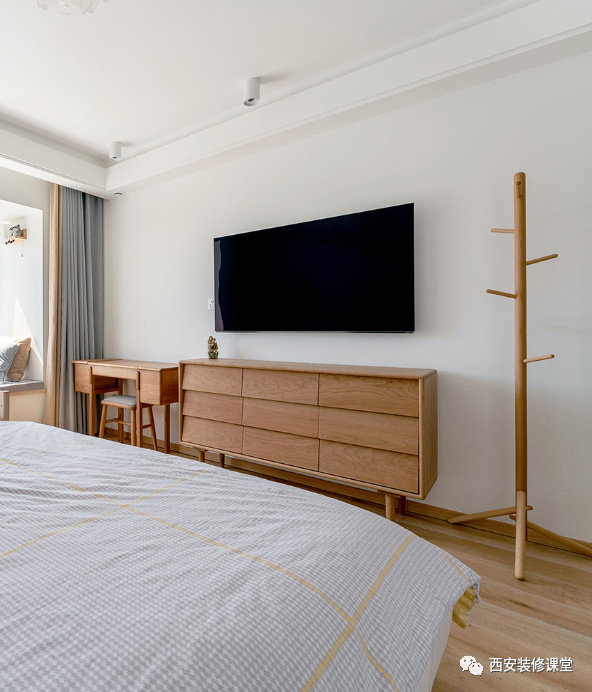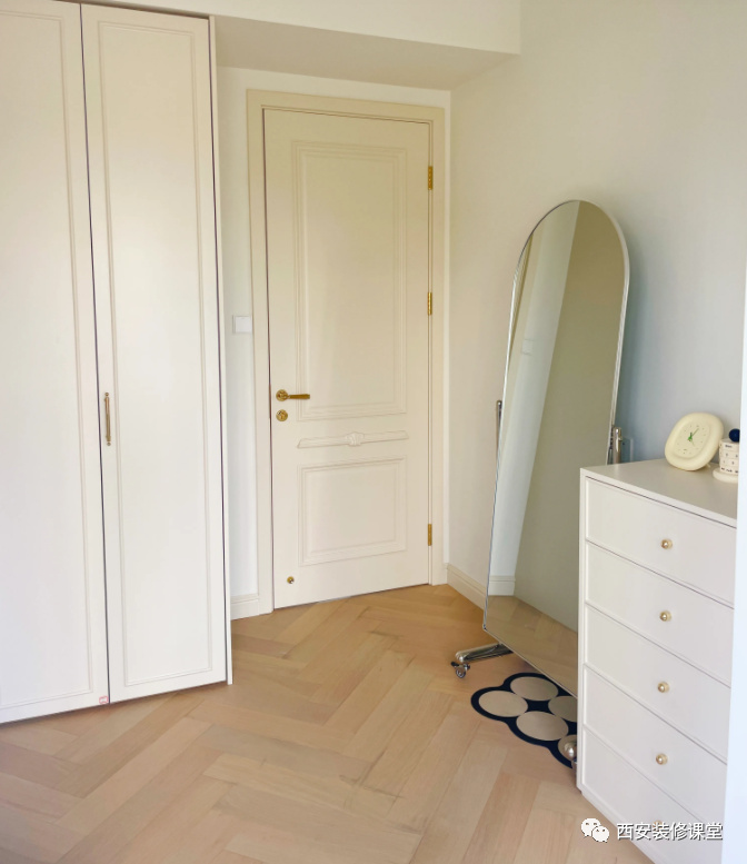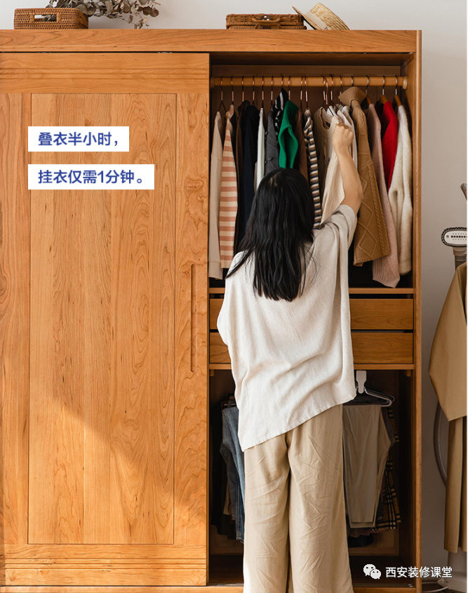 ▲卧室衣柜也是一样,不要做年轻人喜欢的一门到顶,采用成品低矮款成品实木衣柜,环保用材,而且避免了老人登高取物的危险。