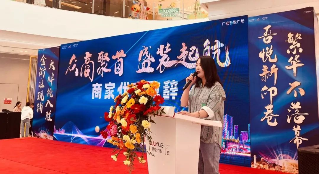 伴随着震撼激扬的音乐,商户代表科学岛李女士上台发言,表达了广大商户对广安吾悦商管团队的信任与支持,并表示将积极配合各项工作的开展,携手迎接广安吾悦新印巷的繁华启幕。表达公司一定能经营好吾悦新印巷的决心,同时对续约新印巷的设计风格、功能布局和业态规划等方面的优势进行了详细的介