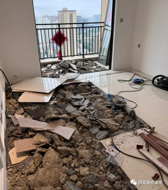 ▲精装修批量生产的装修,地砖大面积空鼓,沟通无果,业主直接砸掉了,这就是现实,维权无门,你能咋?