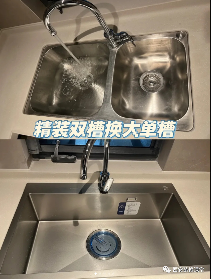 ▲精装修好多厨房都是双槽机器槽,后期没法使用,想要更换比登天都难,谁也不愿意冒着石材报废的风险更换这个水槽,这个几乎太难了