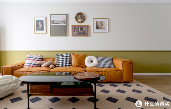 全屋唯一的小造型设计,就是沙发墙石膏板拼色处理了。上半墙刷上杏子灰乳胶漆,下半墙刷上芥末黄乳胶漆,再加上中间的凹凸腰线处理,立马就在提升空间层次的同时,有了不俗的生活格调与艺术品味。当然,这种造型的成本,也几乎可以忽略。