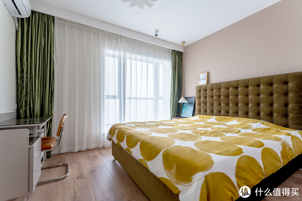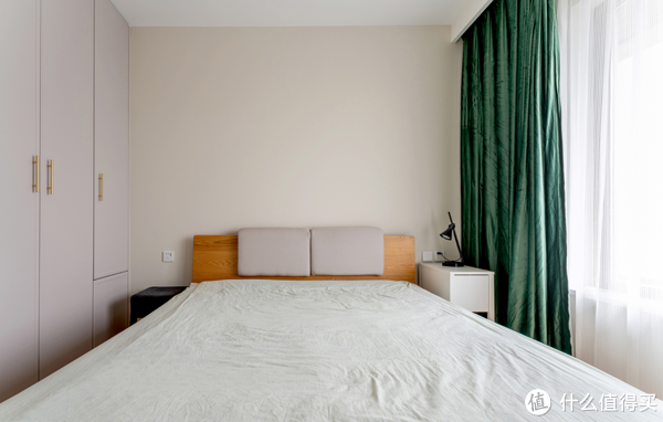 主卧硬装同样以简洁为主,不过墨绿色的窗帘、布莱垦棕床头,以及一张高背绒面的布艺床选择,却也在低调中不失柔美,并且营造出了一个极为温暖安谧的睡眠氛围。