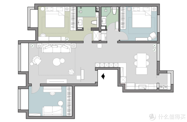 原户型为三室两厅的格局,户型结构十分优质。因此,布局改造这块,也基本上是以局部优化为主,继而最大程度提升居住舒适性。