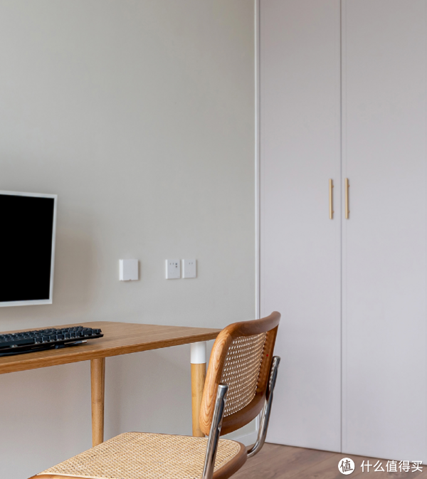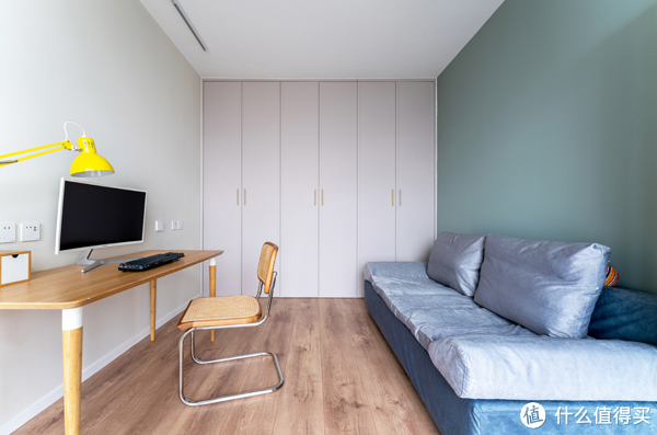 书房作为家里一块安静的办公区,整体以低明度的色彩,营造出了一个清爽宁静的氛围。同时,2米长的活动式书桌,以及一张沙发床配置,也再次赋予了空间更多的功能变化。
