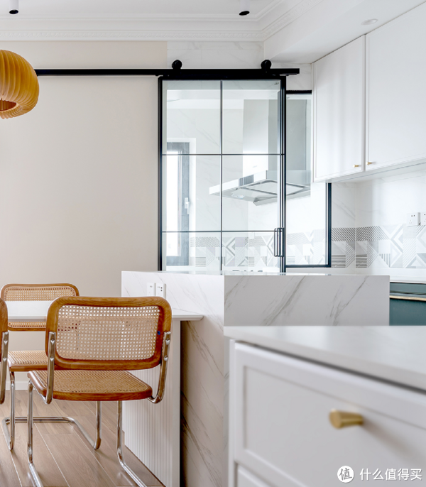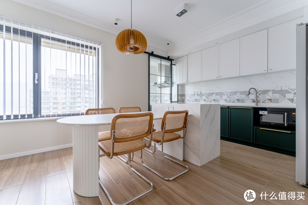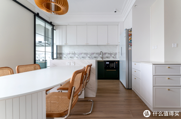 餐厨区保留了一体化的结构,并通过一组中岛台连接,不仅让空间更加开阔通透了,也在日常生活中带来了更多的互动与乐趣,继而应对更多种生活场景。