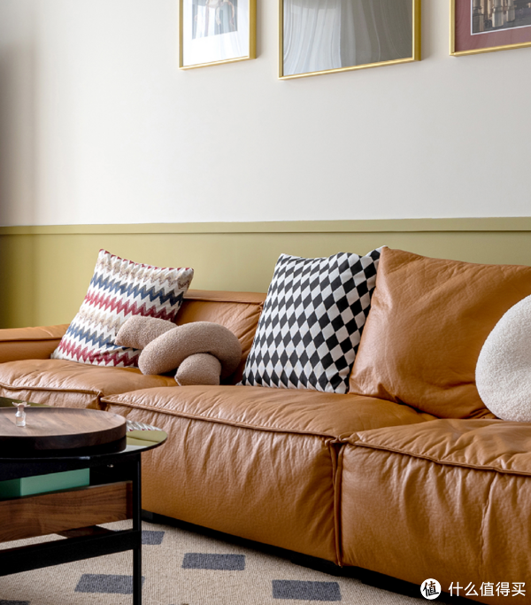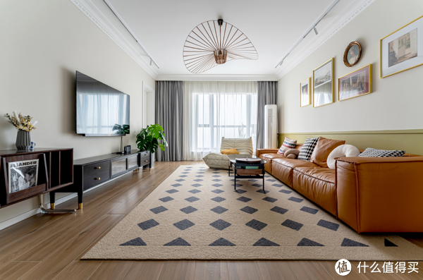 柔软的棕色皮面沙发,不规则的复古装饰画,以及富有几何元素的地毯组合,在强化空间复古气息的同时,一抹安静、美好的氛围也油然而生。