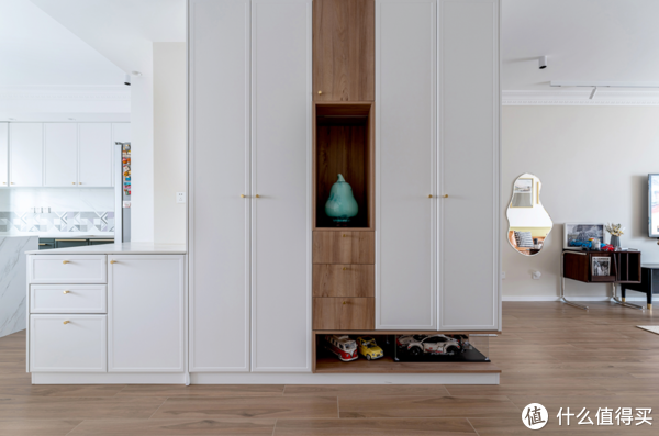 主要的衣物鞋履收纳柜,设计在了玄关转角处。柜体通体到顶,并做部分镂空处理,既在视觉上做到了轻盈,又兼具了端景装饰的功能性。同时,还连接了客餐厅,让空间更加整体连贯了。