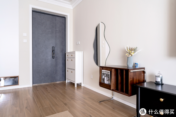 鞋柜则以简易的形式,摆放在了入户门一侧,再搭配一面极具艺术感的曲线镜子,不仅满足了简单的收纳需求,还赋予了空间更多的变化。