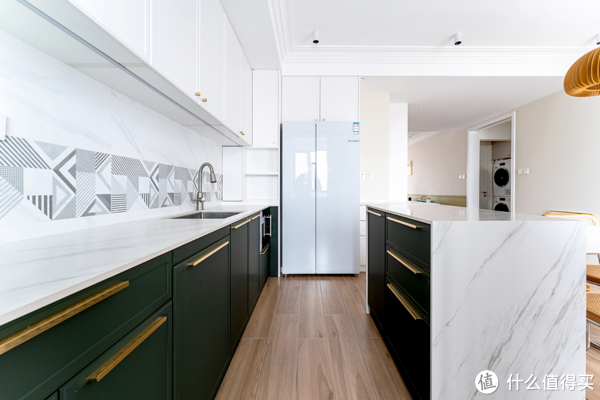 厨房橱柜做了常见的L型布局,并与转角处的鞋柜连接,让空间动线有了延续。上柜以白色为主,下柜以复古绿为主,既呼应了时尚与潮流,又给予了空间一抹简洁的轻奢质感。