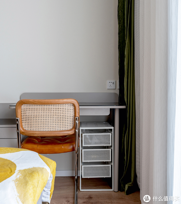 床尾处增加一张组合式书桌,无论是简单的办公阅读,还是作为一张梳妆台来使用,都非常方便。