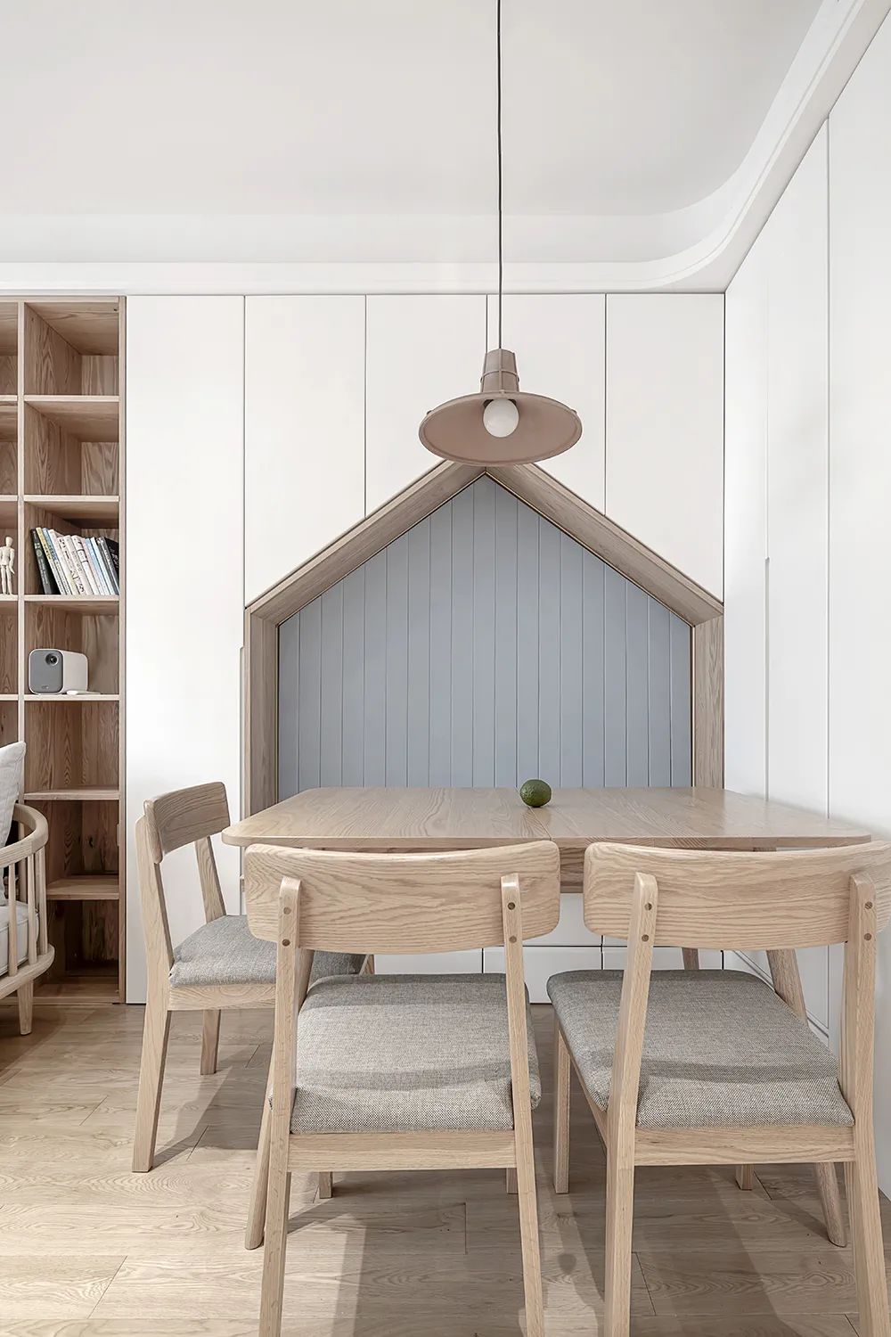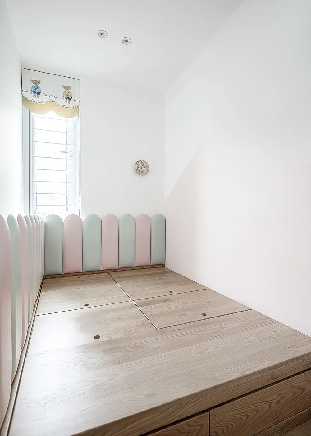 干净的白墙与纯橡木本色的融合,界定出一个慵懒但又充满生命气息的空间,整面的柜体设计用趣味的设计造型表现。