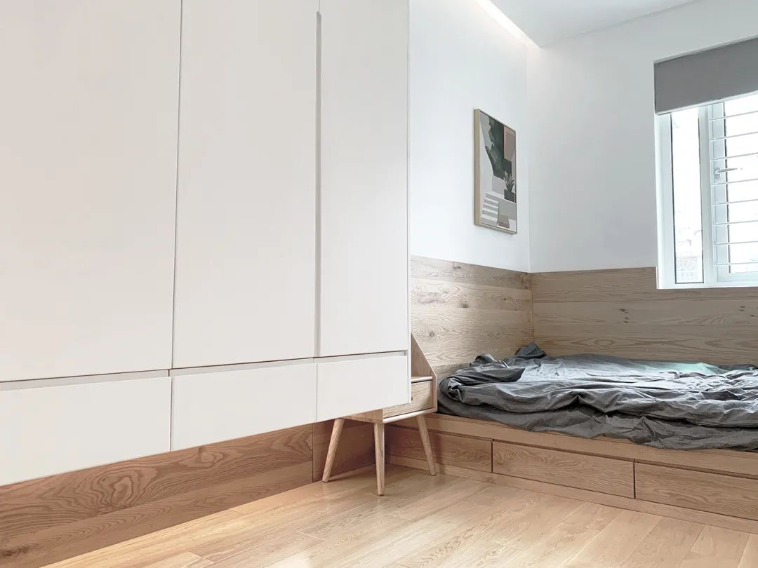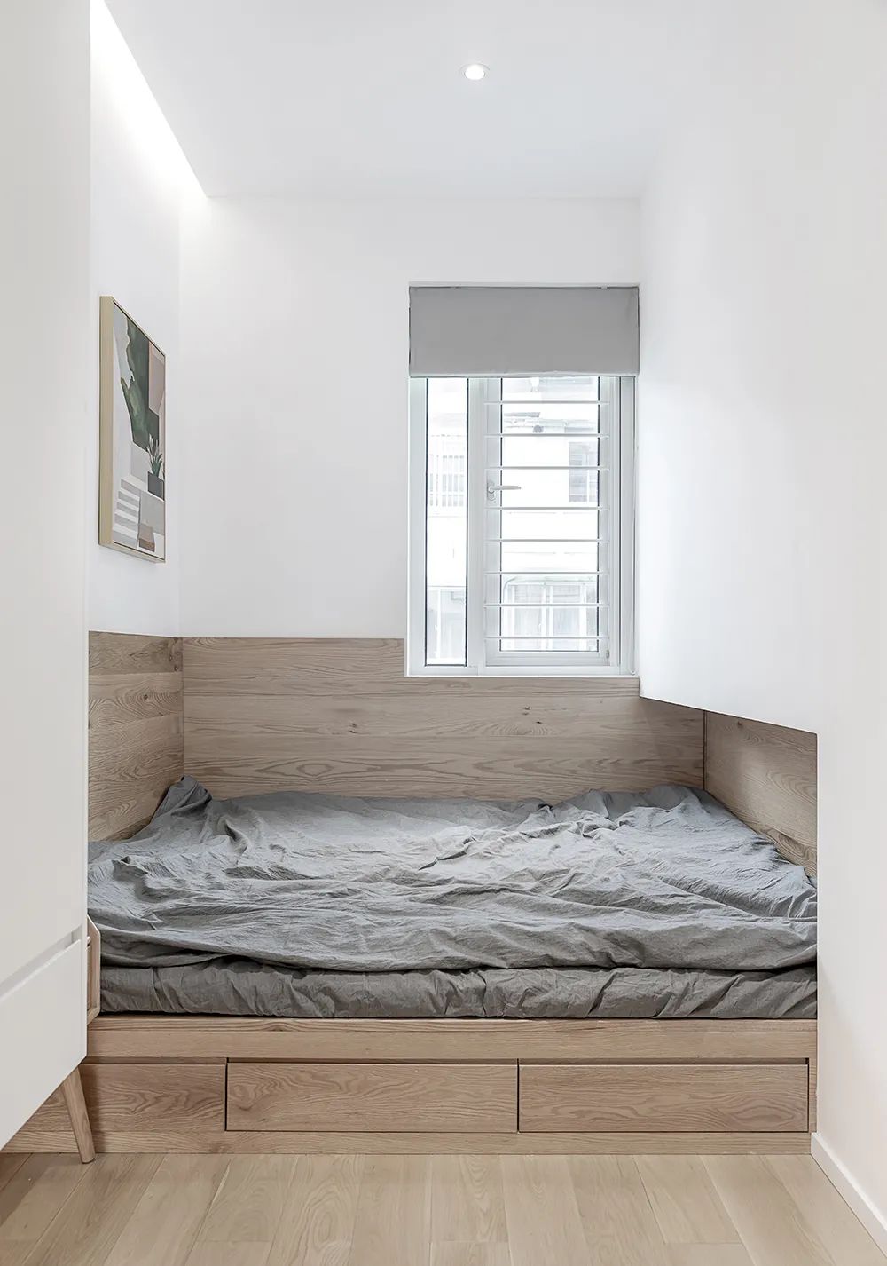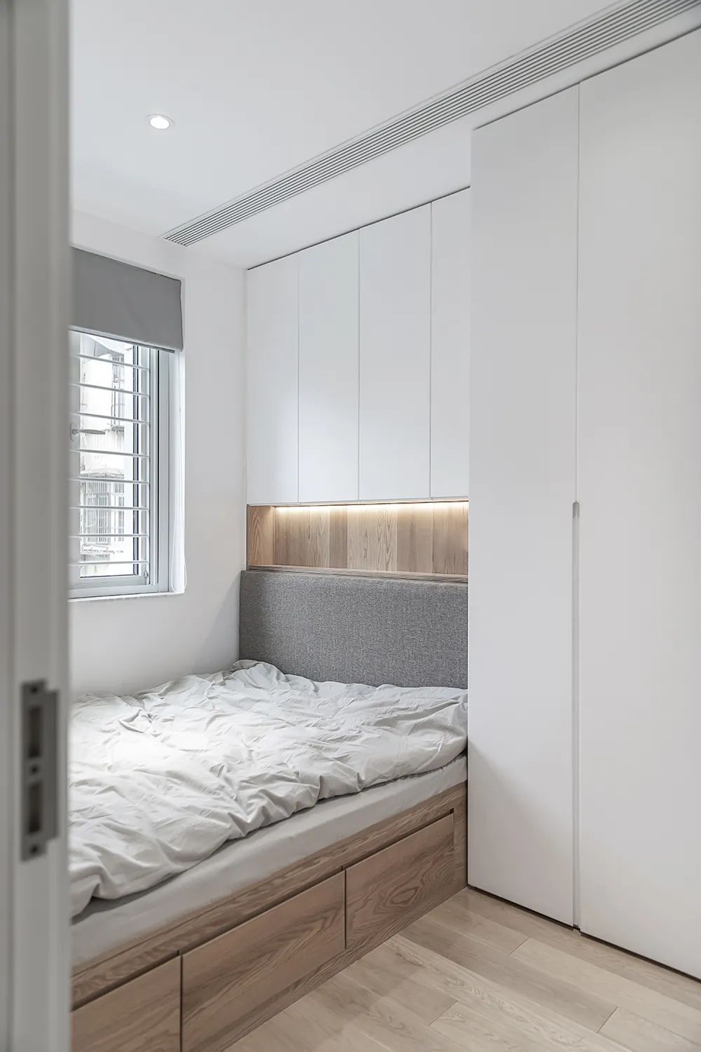 次卧为朝北的房间,次卧的收纳可谓武装到犄角旮旯,暗格式床靠背+预设式养老设计
