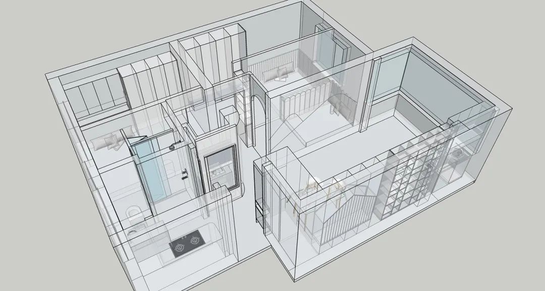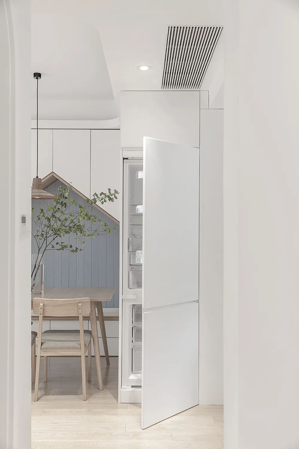 在解决冰箱问题的时候我们发现无论何种款式的冰箱可能都会打破原本的空间氛围,于是推翻了传统冰箱的坐落,「采用嵌入式冰箱」。