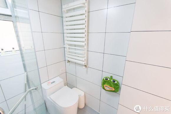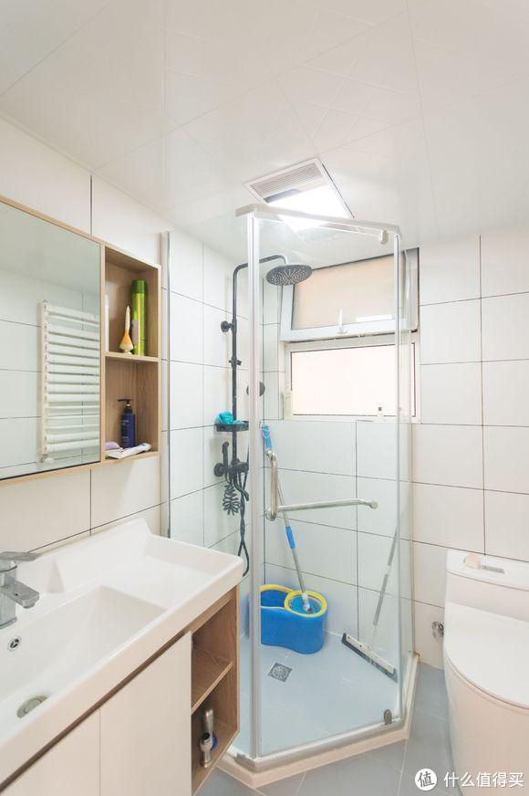 卫生间考虑到光线问题,贴的白色墙砖,空间明亮许多。合理布局浴室柜、马桶和淋浴房,彼此间不影响使用,同时做好干湿分离。