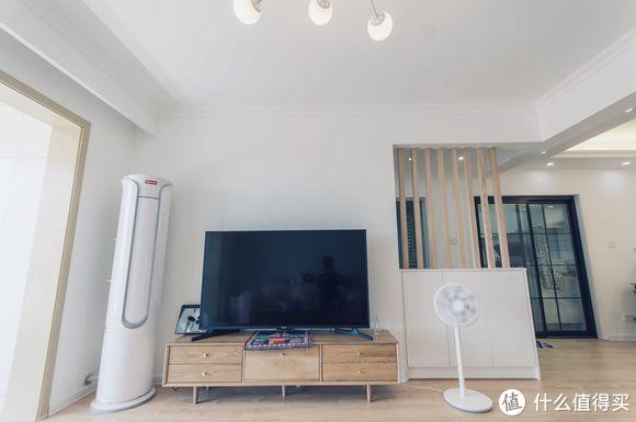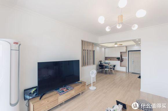 简洁干净的电视墙,没有复杂的造型,连最简单的石膏线都省了。圆柱空调摆放在角落,起到装饰作用。木质电视柜颜色与地板相近,风格上更统一。