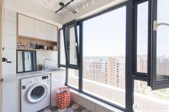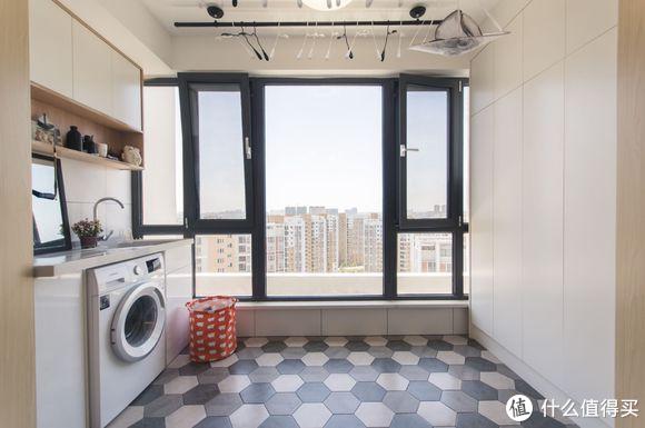 阳台采光和视野都不错,设计太满意了,左侧洗衣柜、右侧收纳柜、地面三色六边形地砖拼接,黑色系统窗和晾衣架,整体呈现出来的效果非常完美。