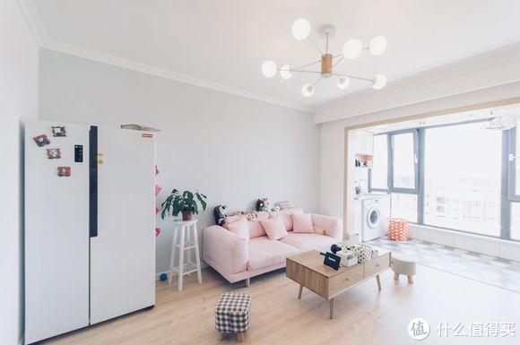 客厅简洁敞亮,大量使用浅色,让更多光线反射,无形中放大面积。客厅打通阳台,空间通透采光好。家具布置齐全,窗帘盒也已经弄好,只差安装窗帘了。