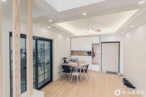 餐厅简洁实用宽敞,独立吊顶设计增加空间层次感。轻盈的细腿儿家具,不仅超级省空间,而且好看极了。餐桌储物柜,木工师傅现场制作,效果好极了,收纳空间多还带换鞋凳和挂衣区。右侧靠墙位置,打算摆放个翻斗鞋柜,实用占用空间小。