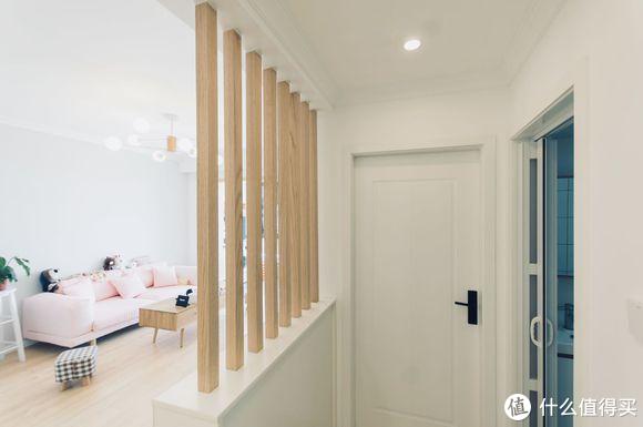 电视墙右侧做了隔断设计,收纳柜+木条结合,增加收纳,空间也不闭塞。