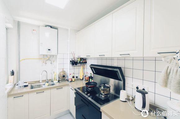 厨房以白色为主,视觉上要宽敞许多。为了美观放弃油烟机,选择了集成灶,安装完看着不错,至于好不好用,只待日后验证了。