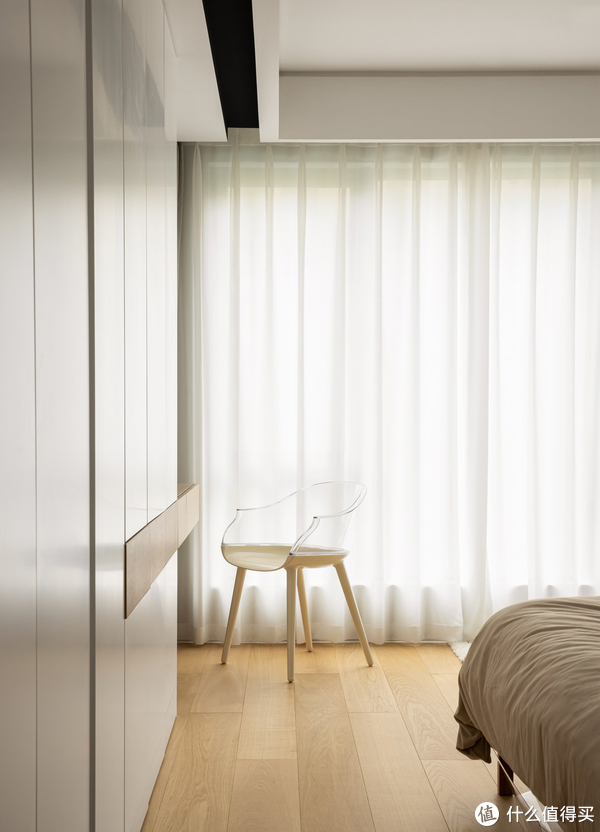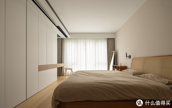 休息区延续了客厅空间的设计元素,作为睡眠的地方,更需要温暖、静谧、优雅的氛围,而此时,我完全感受到了。大地色墙面与藤编大床,在白色窗纱在阳光的照射下,让卧室充满了诗意,与柔和的家具搭配,尽情散发着自然与舒适。