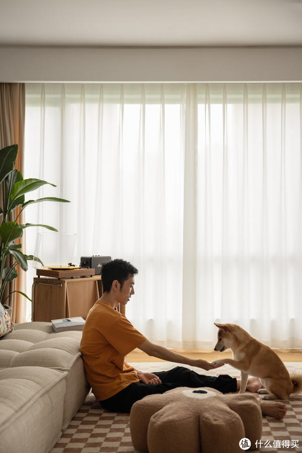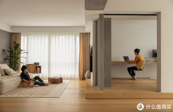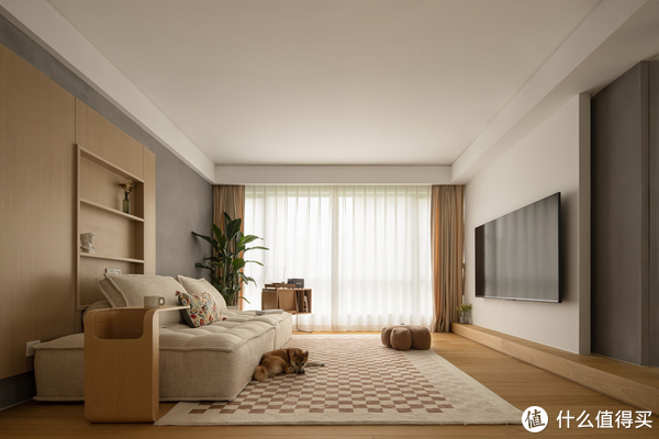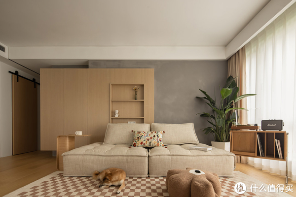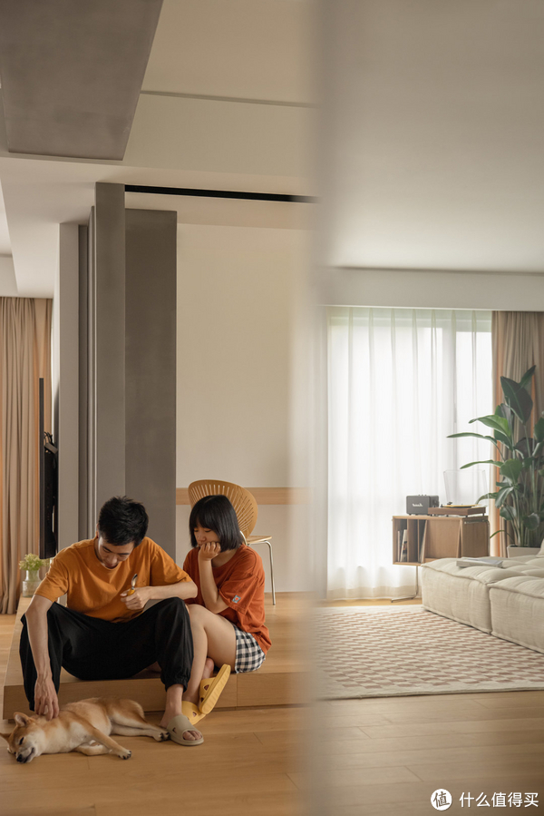 全屋通铺木地板,比起瓷砖,木地板它有更高的舒适感,能让家更显得温暖。再放上两个可移动的豆腐块单人沙发,铺着同色系的地毯,营造出一种轻松温柔惬意的家居效果。平时两人可以坐在沙发上聊天,还可以坐在地毯上逗狗,沙发充当了靠背,反正暂时没有小孩,怎么舒服怎么来。