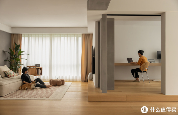 书房整个区域抬高,一直延伸到客厅,充当了电视柜功能,这也是夫妻俩喜欢坐着逗够的地方,坐在地台上,轻松地与在客厅、餐厅、书房三个区域的人聊天。