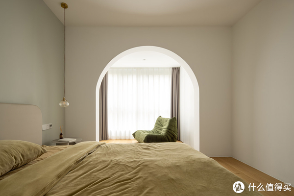 这是次卧室,摆放一张1.5米床,再用青灰色墙漆,就显得格外清爽。拱门外的阳台,一边是衣柜,一边是休闲区,充分利用空间。
