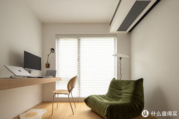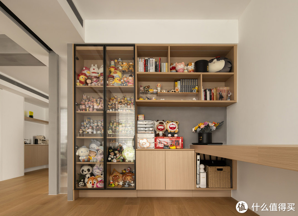 书房里的布置同样很简单,没有过度装修,一个大大的书柜和超长的书桌台面,就成为很好的学习与办公区。书柜里不是被书填满的,而是放着两人都喜欢的手办,看到这些自己喜欢的东西,再累的心也得以舒缓。