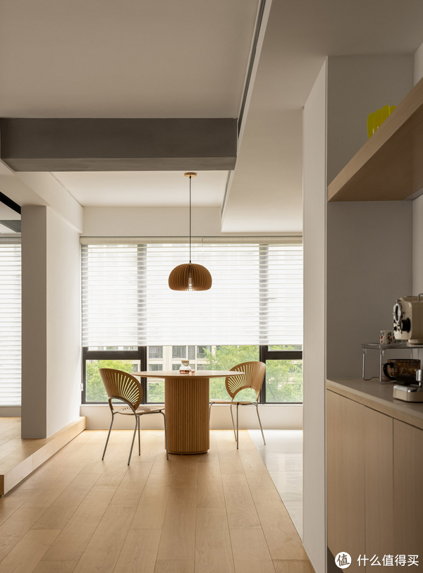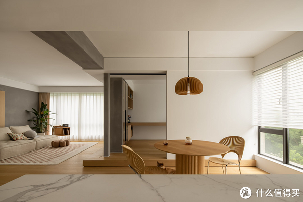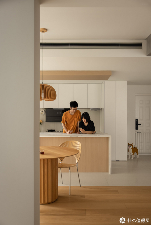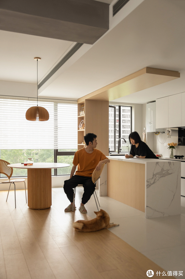 把墙体拆掉后,家里的自然采光更多了,通风更好了,甚至人与人之间的互动变得更加方便与频繁,这也是治愈人心的一个巧妙设计,家里少了沉闷的墙体后,爱人的一个深呼吸都能感受到,空间更显得有温度。