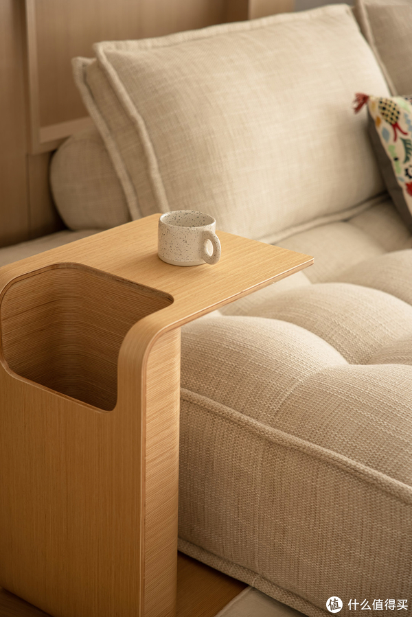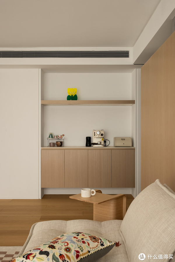 至于另一边的收纳同样做的层板,放两人的喝水杯子,台面可放咖啡机,满足生活中所有的需求。