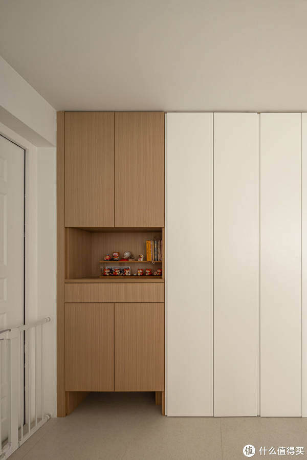 玄关的收纳很足,至少能放置20-30双鞋子,柜体下方安装了灯带。同时在旁边的柜体里还隐藏了一个3.3平方米的储物间,等以后有了宝宝,儿童椅就可以收纳进去。